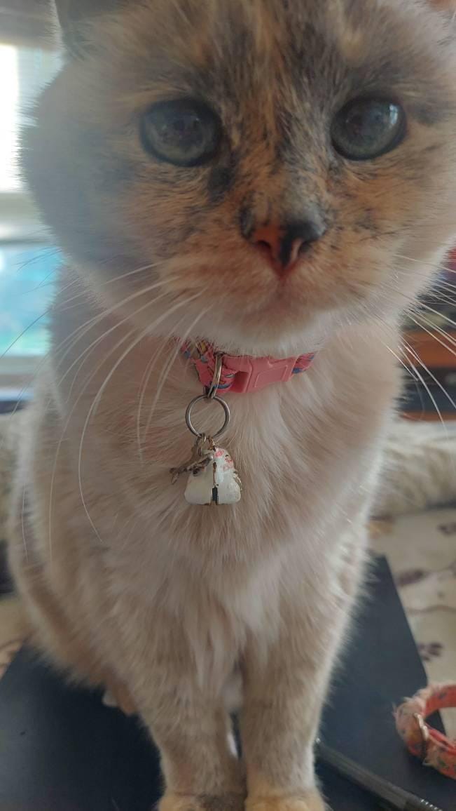 Willowmena wearing her new collar...looking like a cute lil coOkie. It was time for a new one..just put her Happy Cat bell on...viOla...Thx you Lindsey♡♡♡