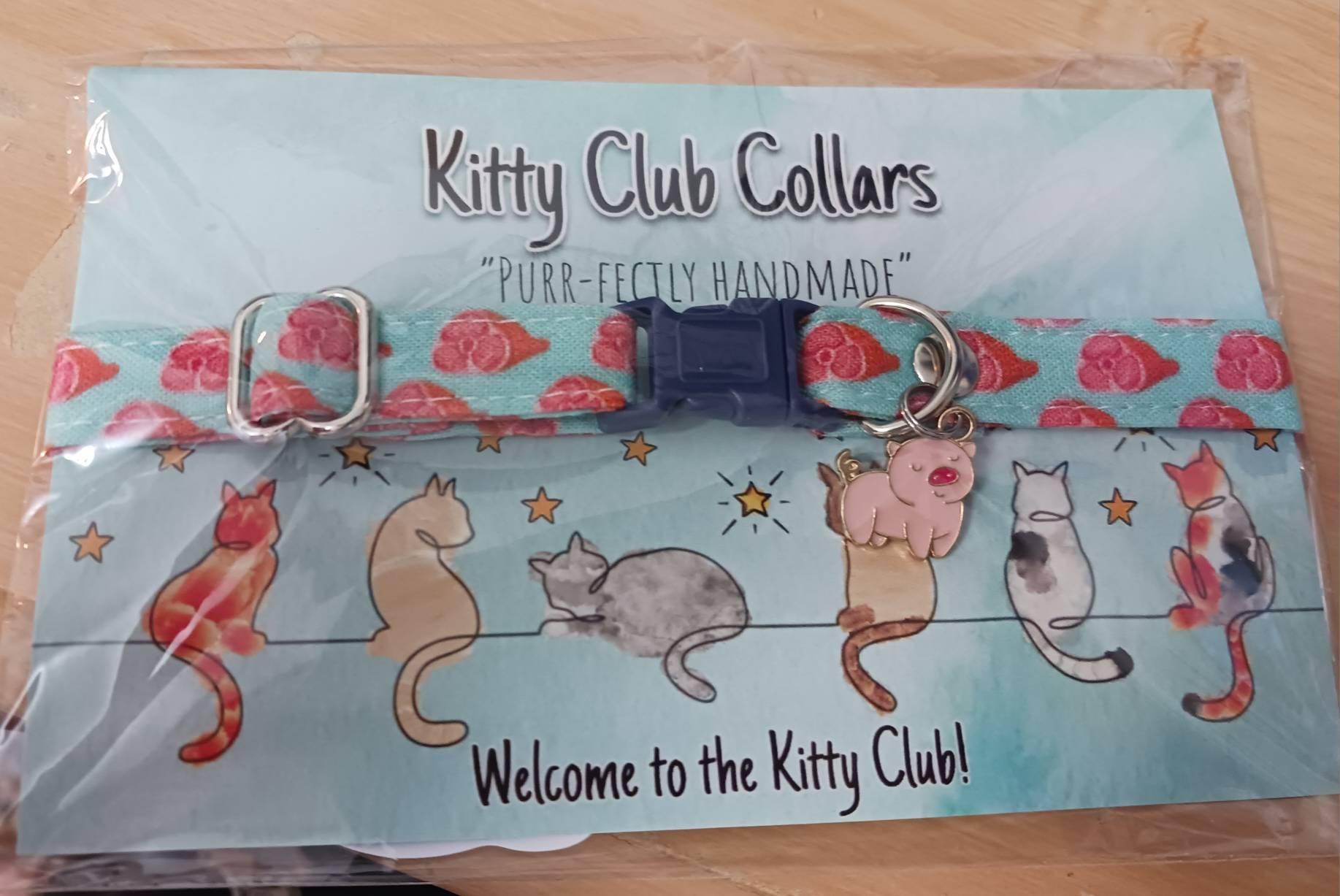 I LOVE cute packaging, so all of my collars are packaged in a way that makes them ready for gift-giving! All collars are sent attached to a teal Kitty Club Collars branded postcard, which is then sealed in a transparent bag. I also always include a couple cat stickers with every order. :)
