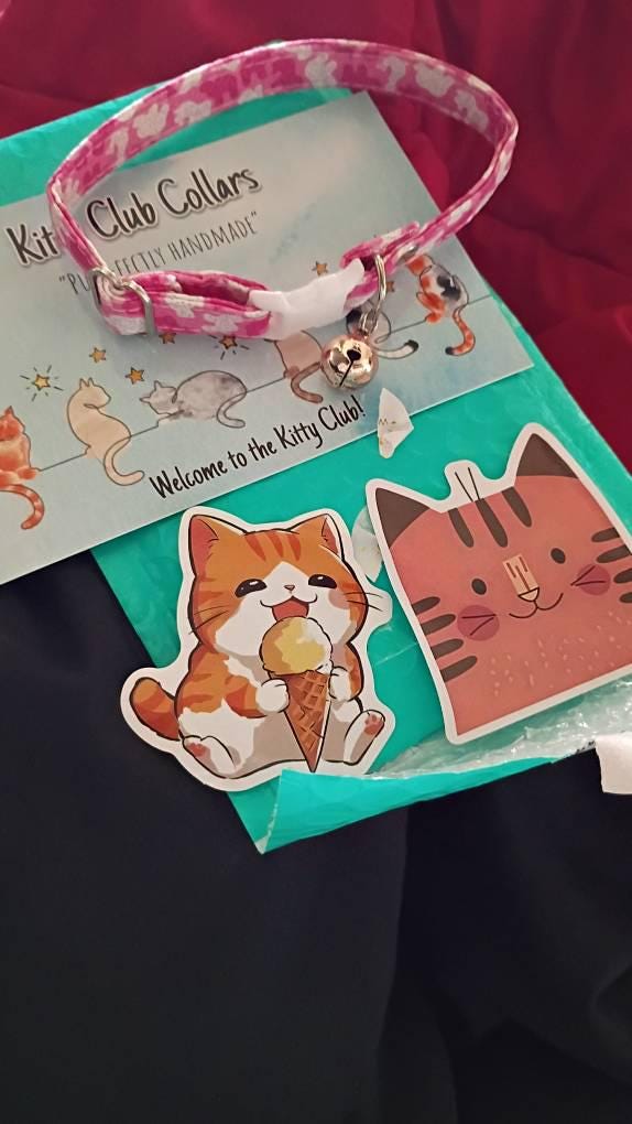 I LOVE cute packaging, so all of my collars are packaged in a way that makes them ready for gift-giving! All collars are sent attached to a teal Kitty Club Collars branded postcard, which is then sealed in a transparent bag. I also always include a couple cat stickers with every order. :)