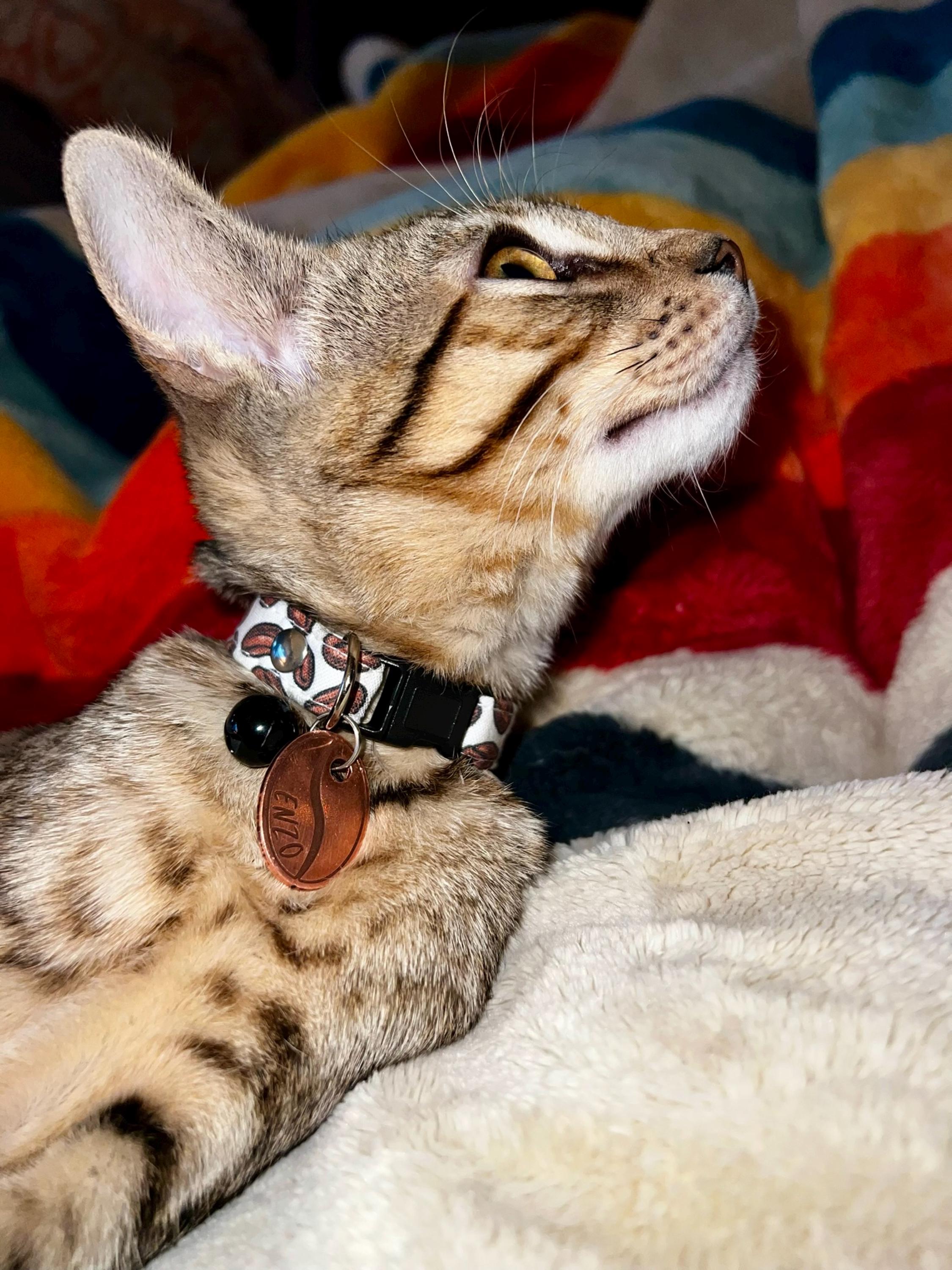 I recently adopted an 8 month old all black American Shorthair after my Tuxedo boy passed away. The new little guy is so full of energy that I named him Mr. Coffee. Naturally, when I found your coffee bean collar with the coffee charm, it felt as right as adopting Mr. Coffee! Mr. Coffee is now outfitted with the cutest and most well made collar! Thank you for your care and craftsmanship! It's meowvelous!